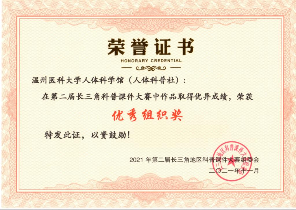 在2021年第二届长三角地区科普课件大赛中,蜜桃视频 人体科学馆、人体科普社取得佳绩。近日,收到了来自温州市科协科普部寄送的获奖证书。此次赛事,人体科普社共报送了6个作品,其中作品《预防颈椎病,向“低头族”说拜拜》荣获一等奖,《疫苗!到底该不该》荣获三等奖,《有关鼻子的那些事儿》《5G+医学(远程手术)》获入围奖,蜜桃视频 人体科学馆(人体科普社)获评“优秀组织奖”。据悉,长三角地区科普课件大赛由...