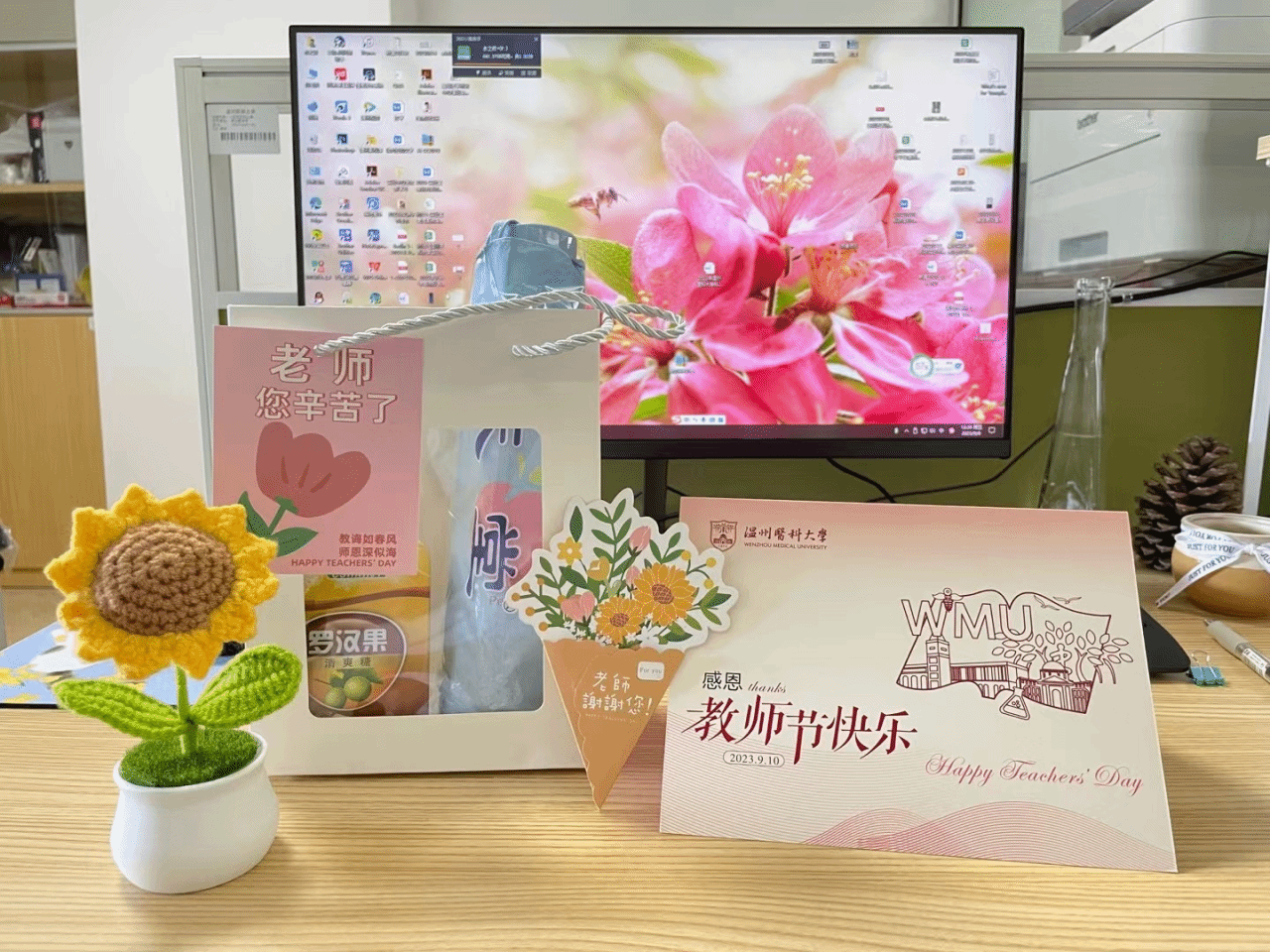 2023年9月8日上午,开学第一天,在第39个教师节的到来之际,蜜桃视频 学院工会、妇联组织学生开展感念师恩活动,致敬辛勤耕耘、无私奉献的蜜桃视频 老师。教研室、实验室里和会议室里,基础医学专业学生代表送上了雨伞、润喉糖、向日葵花和贺卡等礼物,向辛勤付出的老师们表达了深深的敬意。“老师,您辛苦了,祝您节日快乐!”,表达了莘莘学子对老师们无私奉献精神的感激之情。一束鲜花,一声祝福,满满的仪式感,让老师们感受到学院的温暖,...