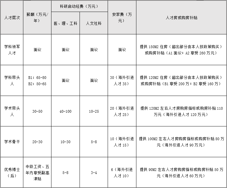 学校高层次人才引进分为五个层次:学科领军人才(A1、A2),学科带头人(B1、B2),学术带头人(C),学术骨干(D),优秀博士(后)(E)。
