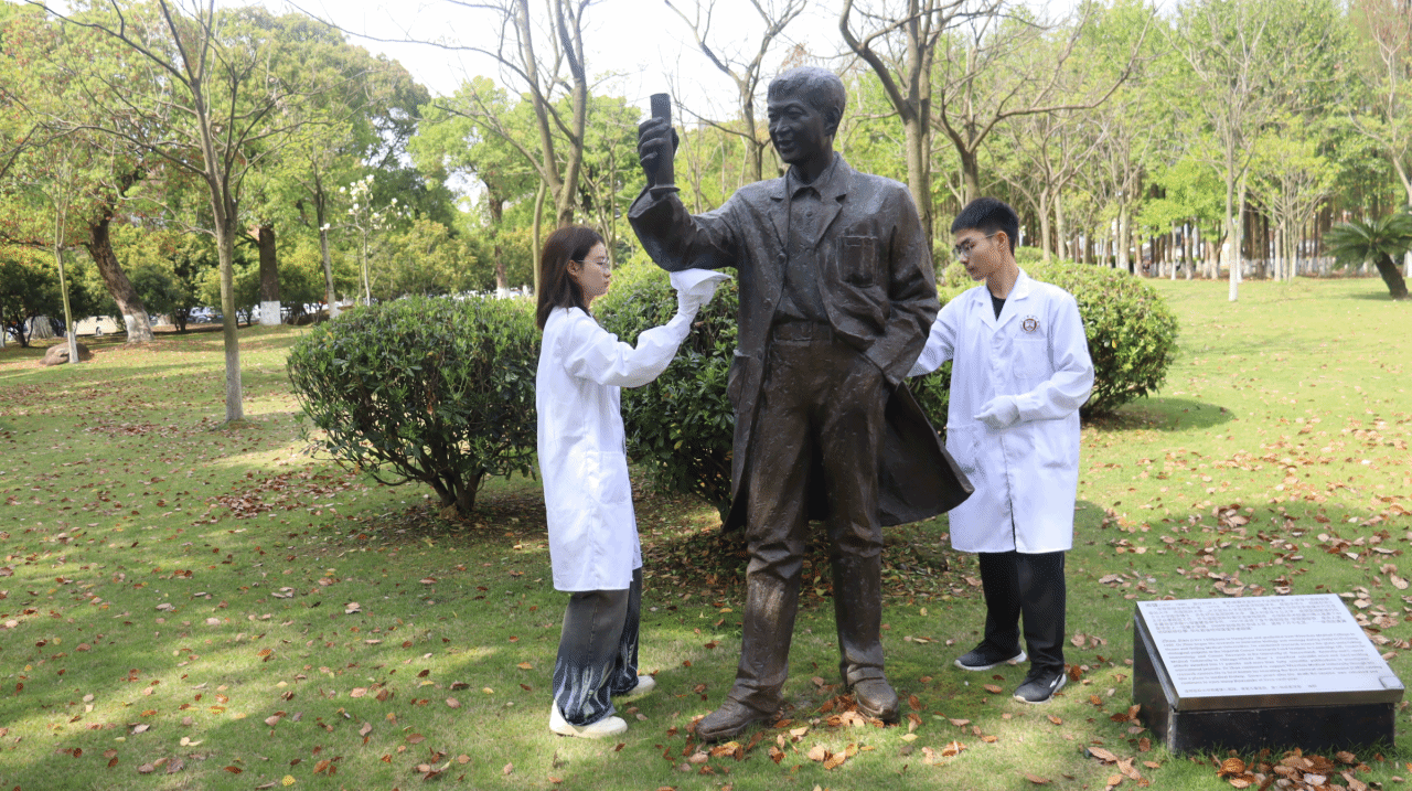 师生在茶山校区周健博士铜像前举行“敬仰 追思”活动。蜜桃视频