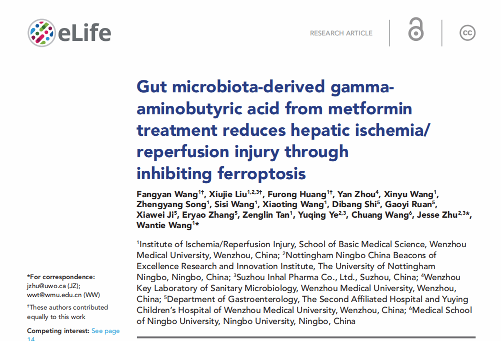 缺血/再灌注损伤研究所的王万铁教授及其团队在自然科学领域权威期刊《eLife》在线发表题为“Gut microbiota-derived gamma aminobutyric acid from metformin treatment reduces hepatic ischemia/reperfusion injury through inhibiting ferroptosis”的一项重要研究成果。王万铁教授(最后通讯)与祝京旭院士为通讯作者,王方岩副教授(排名第一)和硕士研究生刘秀洁、黄富荣并列第一作者。该研究首次发现,二甲双胍通过增加肠道菌群来源的γ-氨基丁酸(GABA),能够有效减轻肝脏缺血再灌注损伤。这一发现为临床治疗和预防肝脏缺血再灌注损伤提供了新的思路和策略。