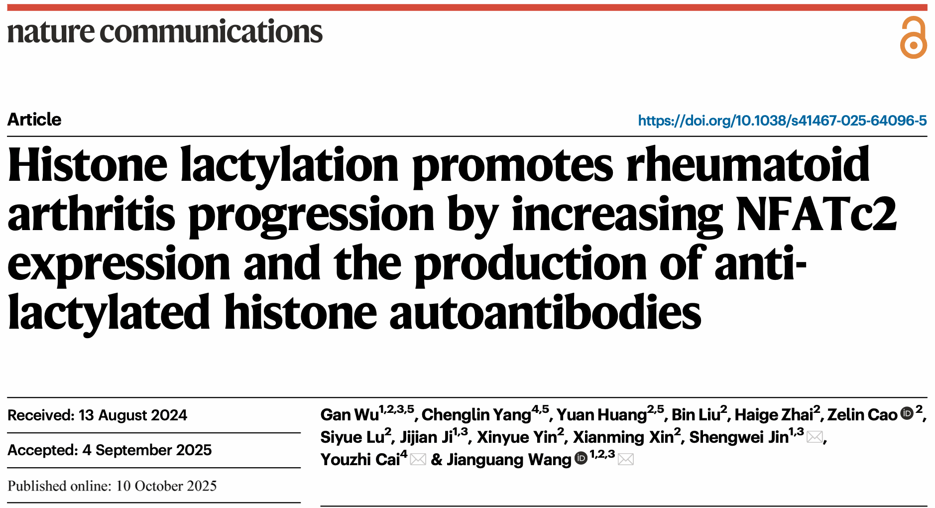 王建光/金胜威教授研究团队在《自然·通讯》(Nature Communications)上发表了题为《Histone lactylation promotes rheumatoid arthritis progression by increasing NFATc2 expression and the production of anti-lactylated histone autoantibodies》的研究成果。