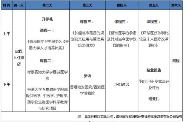3.项目内容:邀请香港大学顶级专家和教授为学生授课,从对香港的医疗体制开始,围绕医学前沿等相关主题的讲座,增加学生对专业知识和医学领域国际前沿研究成果的认识;同时可以结识来自不同地区不同文化背景的同伴,建立人脉网络。参加的学员可以获得由香港大学颁发结业证书,根据学员的出勤率、结业汇报等完成情况,优胜小组学员获得推荐信。具体课程安排如下: