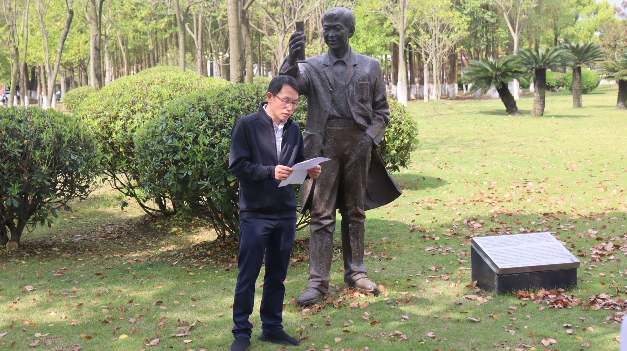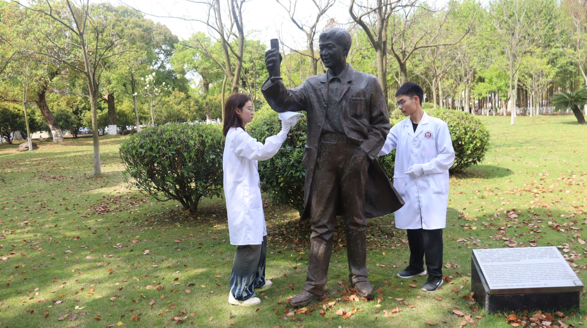师生在茶山校区周健博士铜像前举行“敬仰·追思”活动。蜜桃视频