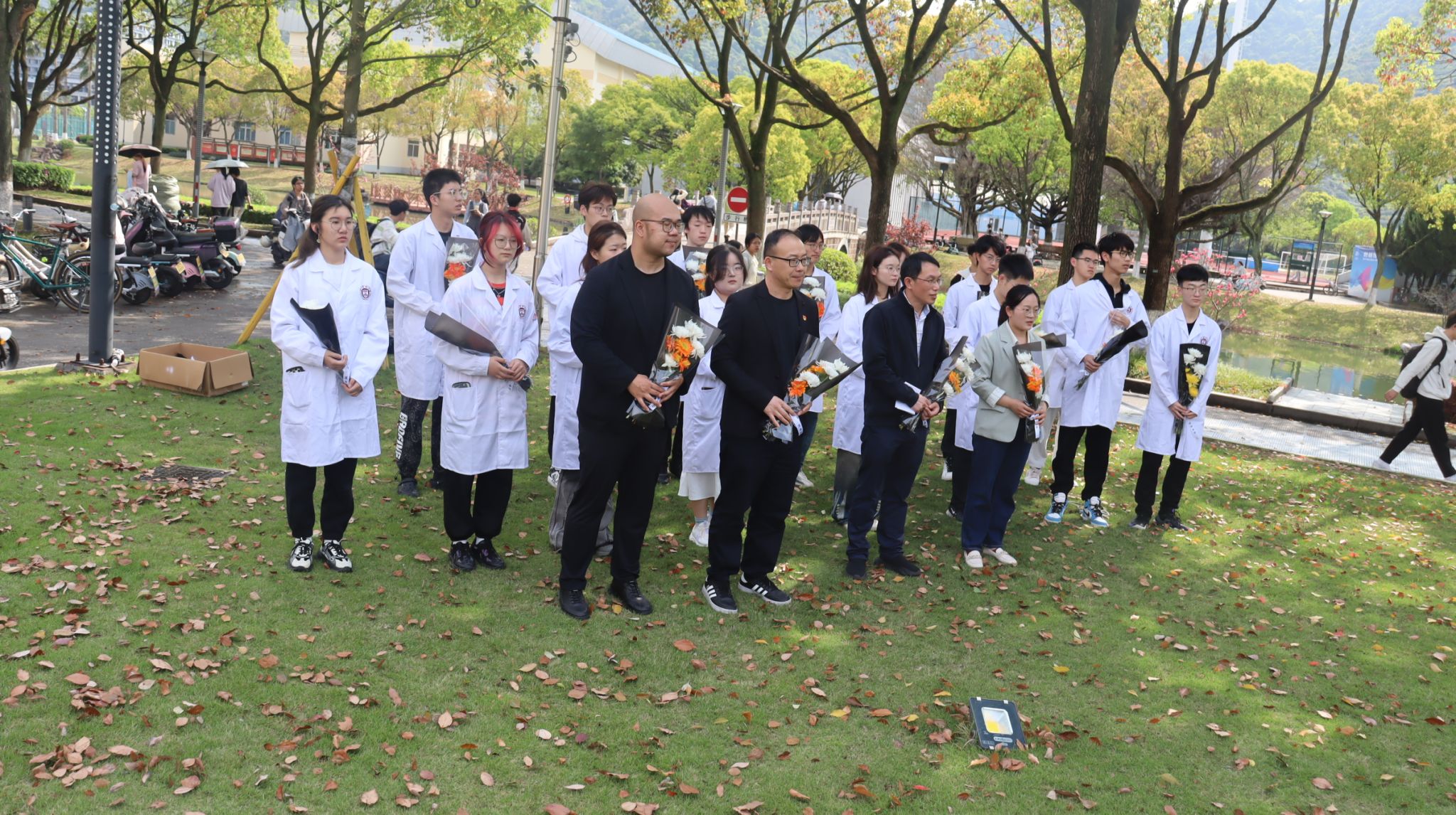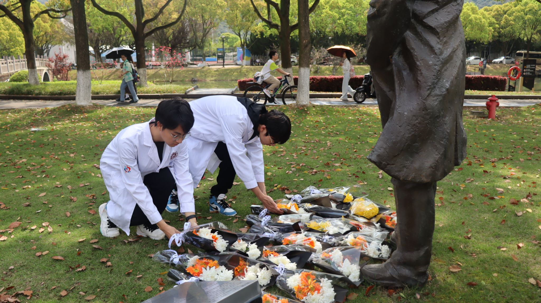 聆听事迹后,全体师生在周健博士铜像前整齐列队,肃立追思。在追思的无言中,同学们深切地体会到周健博士身上的医学科学家精神,为医学界做出的巨大贡献。接着,两位学生代表上前擦拭周健博士铜像,随后全体师生依次上前敬献花束,以表达对周健博士的敬仰、追思之情。
