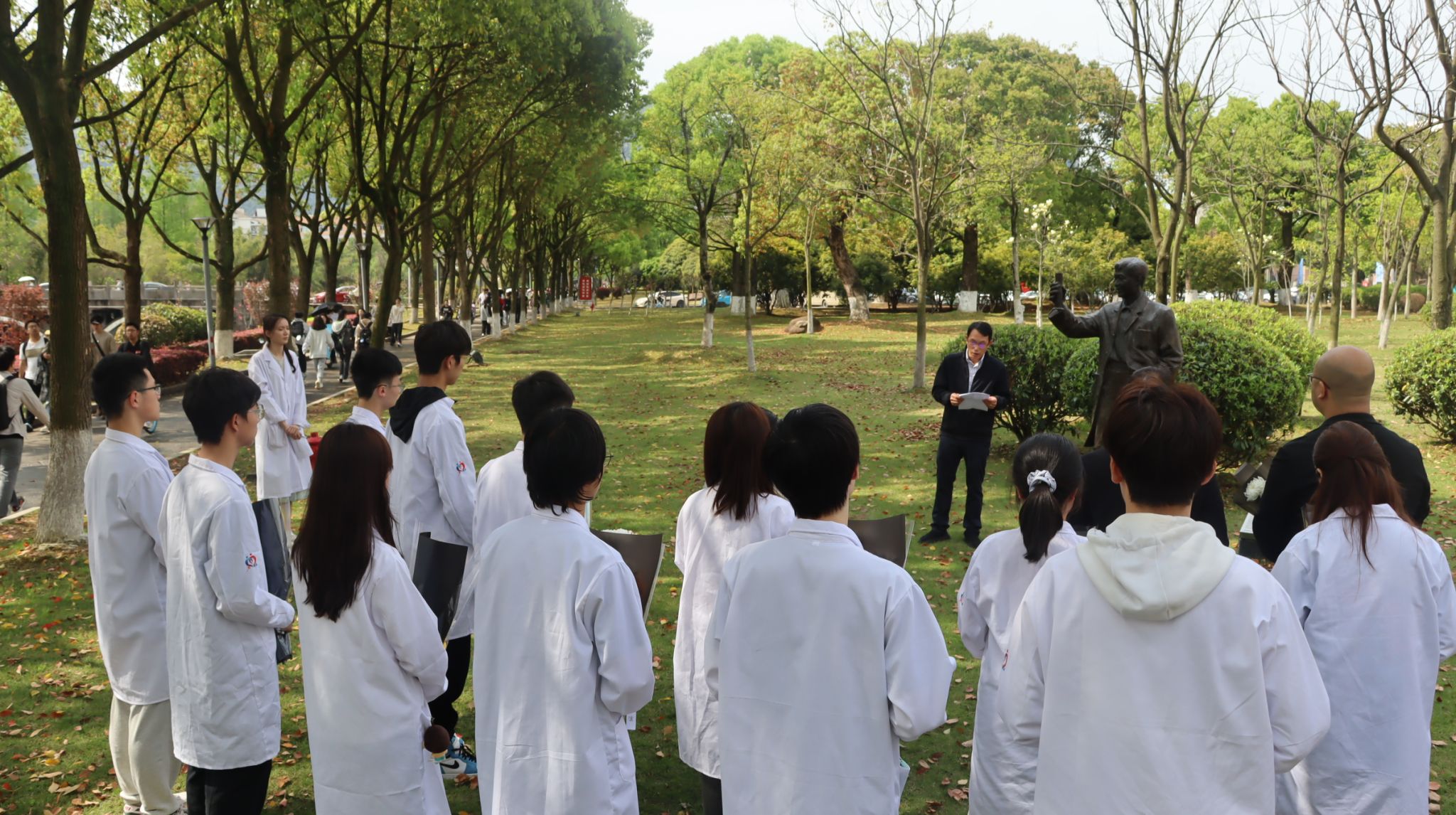 活动伊始,师生们手持花束来到周健博士铜像前,怀着崇敬的心情,听薛向阳院长简述周健博士的生平事迹。他指出,周健博士是求学奋进的,他一生致力于人乳头瘤病毒(HPV)的研究;周健博士是无私奉献的,经历多次试验,利用重组DNA技术合成了HPV病毒样颗粒,为成功研制宫颈癌疫苗提供了坚实的研究基础。周健博士虽未能看到其心血结晶在医学界的巨大作用,但这惠及了全球千万女性的成果却实实在在地永存人间;周健精神是历久弥新的,勉励同学们要学习“顶天立地、奇思妙想、仁心大爱”的周健精神,在医学的道路上奋勇前进。