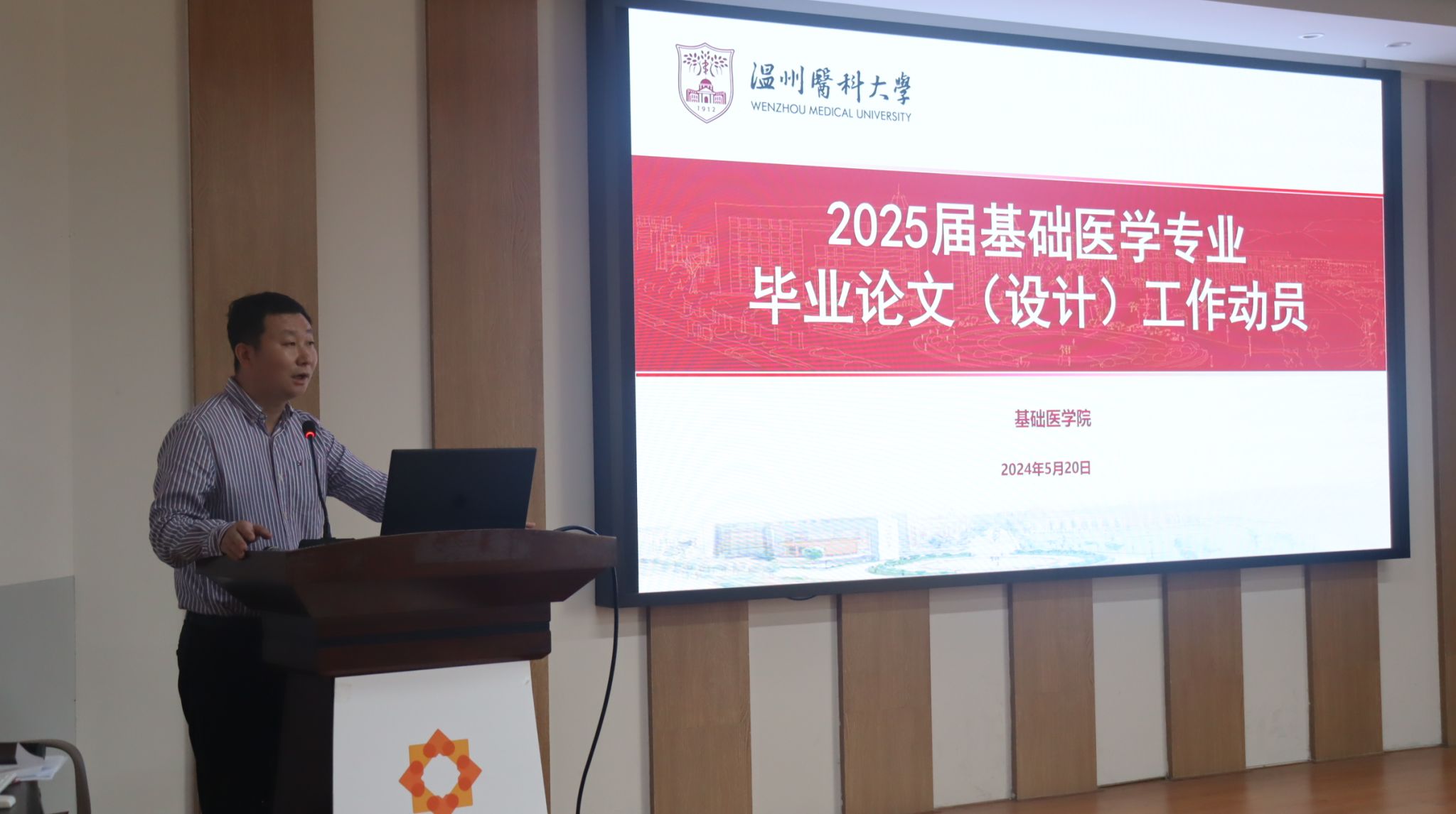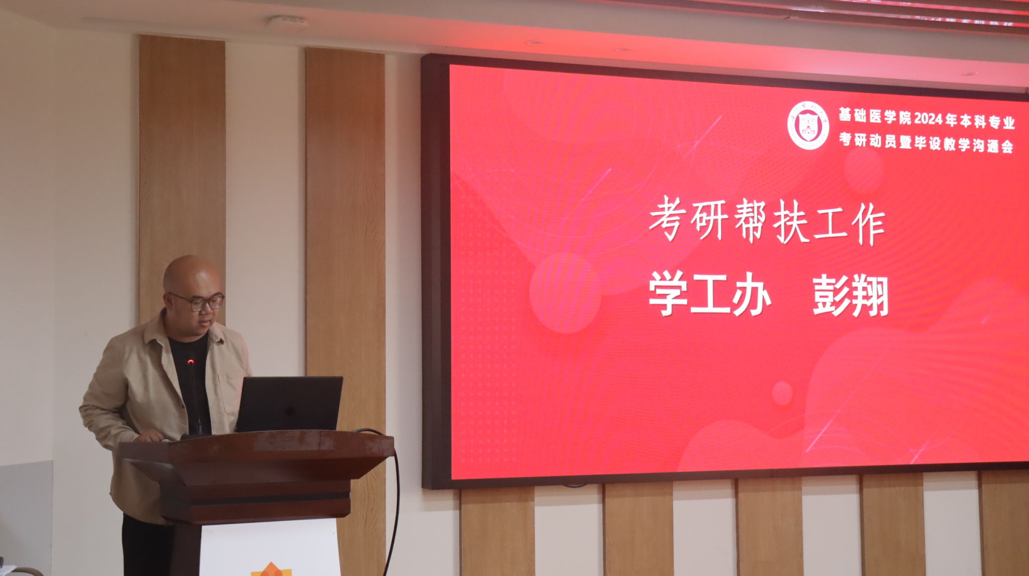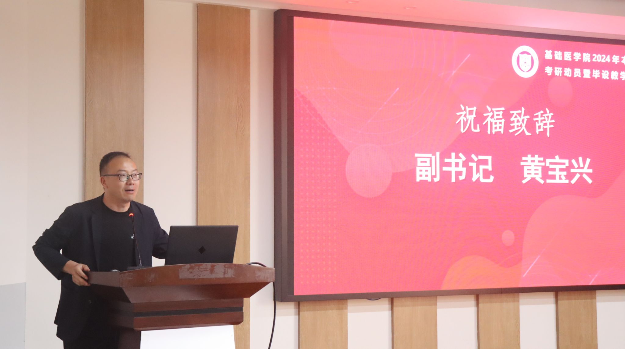在学生活动中心向阳工坊举行2024年度考研升学暨毕业设计动员会。学院党委副书记黄宝兴,副院长蒋朋飞,教学办、学工办相关负责人,及全体2020级基础医学专业本科生参加会议。