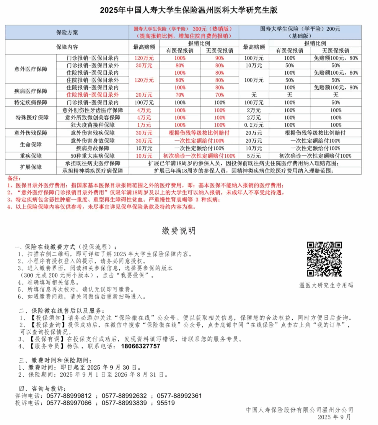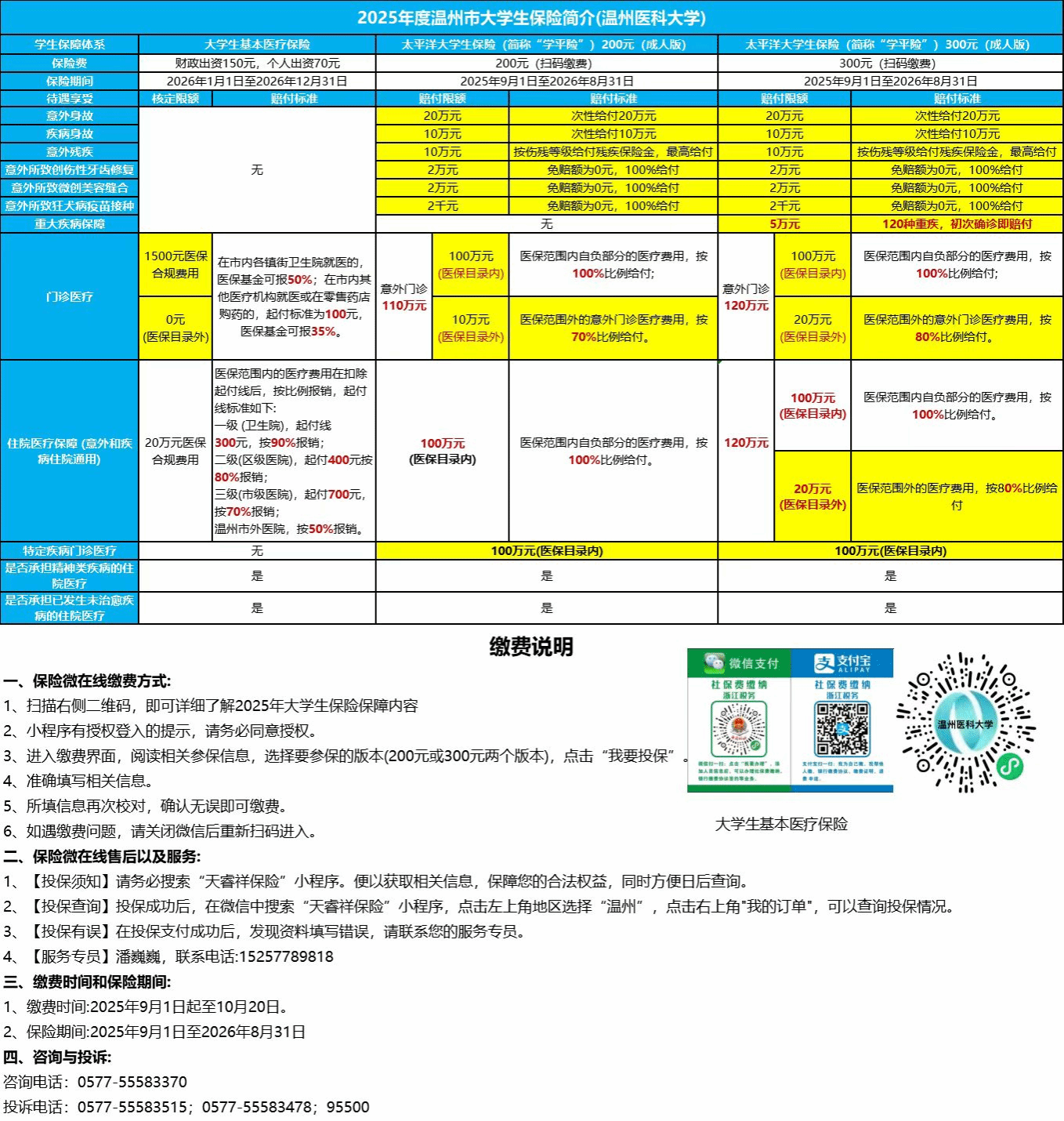 1.如参保同学对大学生基本医疗保险和学平险有疑问,请与辅导员张老师联系,联系电话:0577-86699692,联系地址:同仁楼7A214。