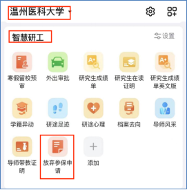 已参加城乡居民基本医疗保险、新型农村合作医疗保险等(简称农保),父母子女统筹医疗保险等的学生,通过钉钉工作台提交放弃参保申请(如图1)。(审核路径:学生申请(上传查询界面,如图2)→辅导员审核→研究生院审核)