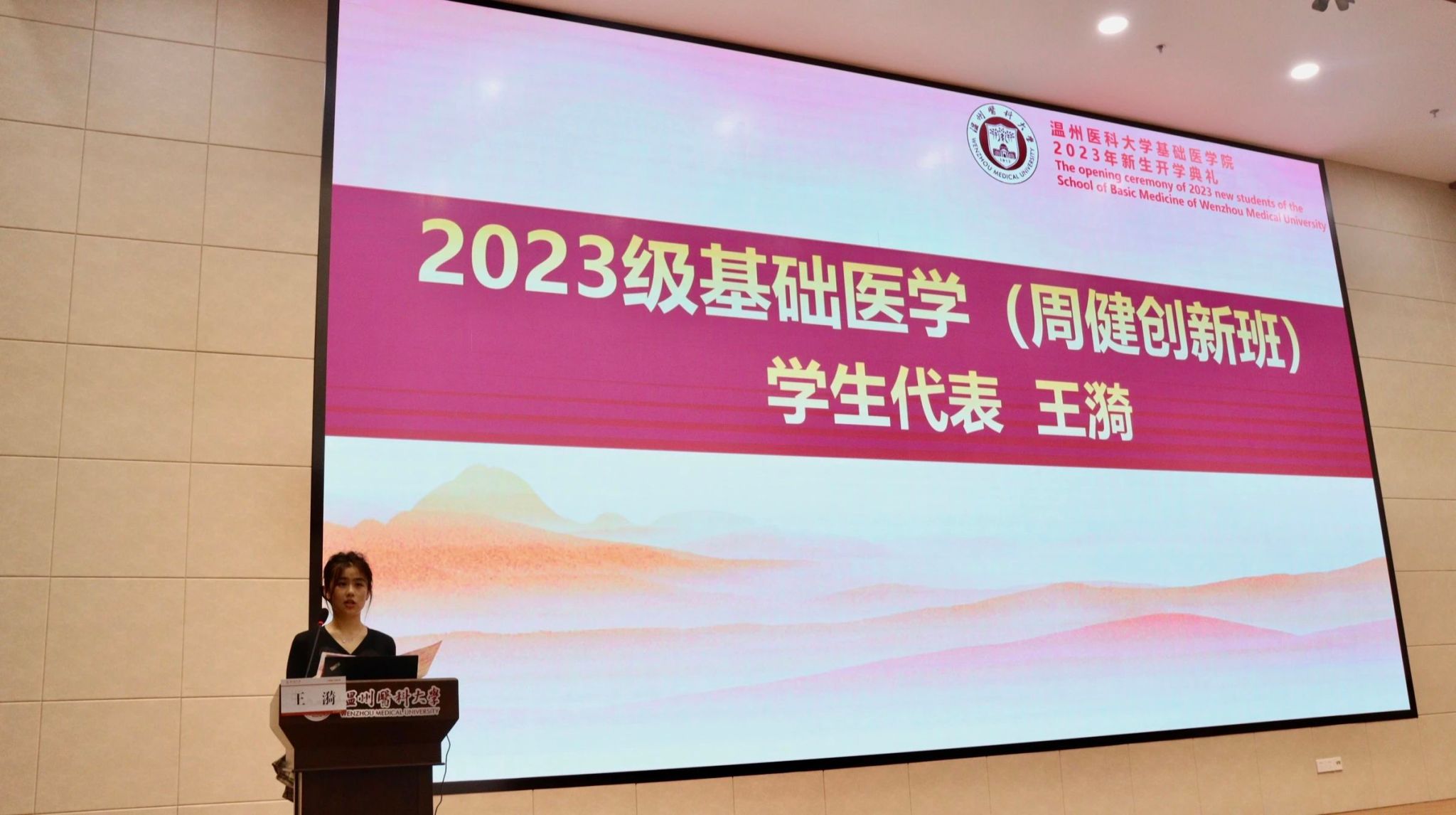 在新生代表发言环节,本科生代表王漪同学向大家分享了初来温医大的感受:在军训期间,学院的引导、师长的帮助、朋辈的关怀都让初来乍到的她迅速适应新环境、产生归属感。她还提到,基础医学的学习,不仅需要反复试错,还要有极致的耐心和冷静的头脑。希望大家可以通过温医大广阔的平台实现自我价值,努力提升自己。