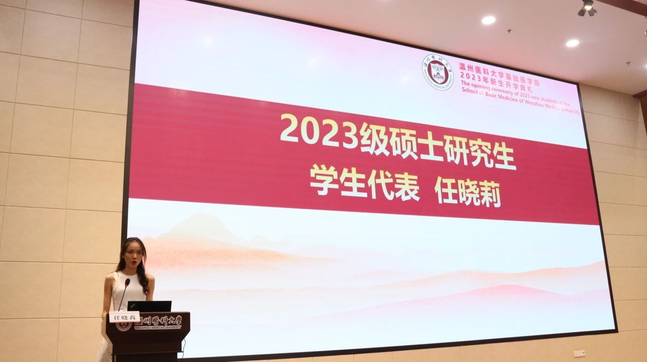 2023级任晓莉同学作为研究生代表发言。她首先表达了成为温医人、基础人的无尽喜悦,回顾了过去艰辛的备考经历,展望着新一代“温医人”的未来。她号召新生永怀赤子之心,积极进取,主动作为,为中华民族伟大复兴贡献自己的力量。
