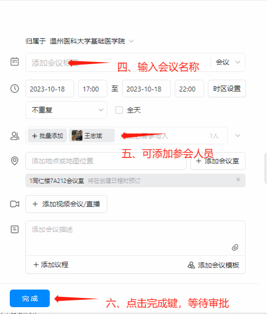 2、选择召开会议的日期,点选会议具体时间,点击下一步,输入会议名称,在点击左上角完成键后等待审批。