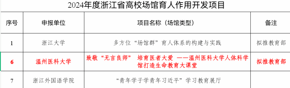 人体科学馆打造生命教育大课堂”项目成功入选2024年度浙江省高校场馆育人作用开发项目。