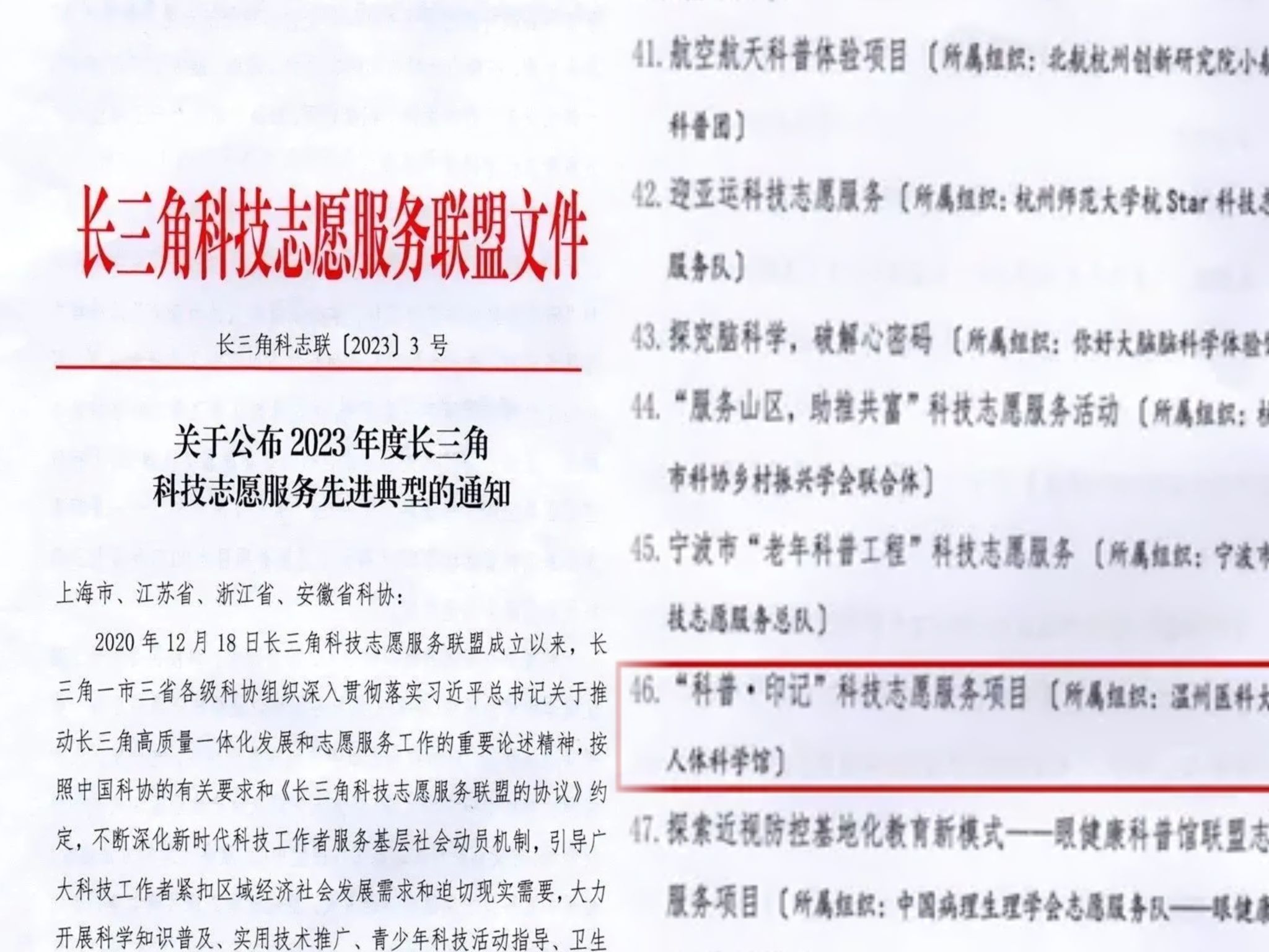 长三角科技志愿服务联盟公布了科普助力双减 放“假”不放“学”——暑期青少年系列科普活动等93个先进典型科技志愿服务项目,我校人体科学馆“科普·印记”项目喜获2023年度长三角科技志愿服务优秀项目奖。