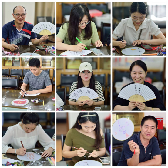 活动现场,教职工和学生代表们拿起彩笔,将自己对传统文化的感悟付诸笔端,经过耐心描画,生动的图案跃然扇面,大家向同伴分享自己的作品并合影留念。