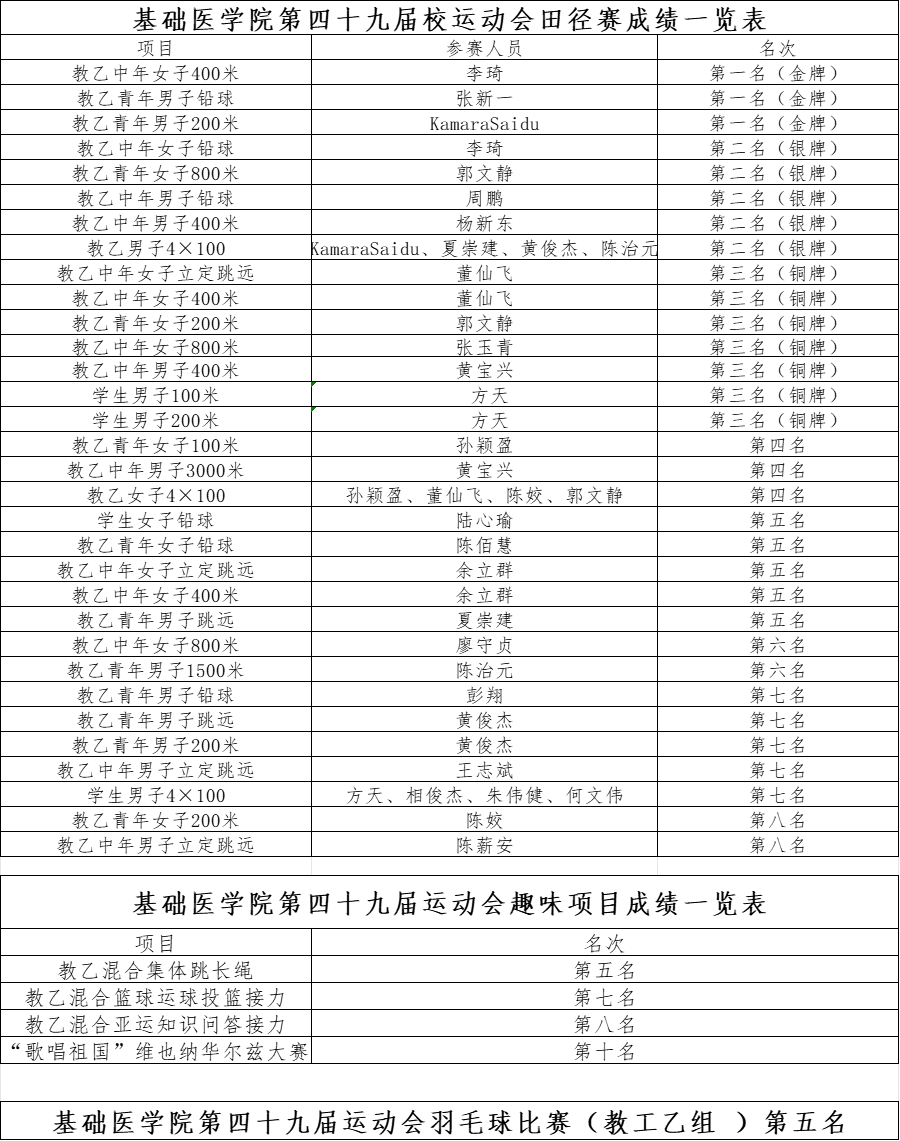 学生组男子4×100米获第七名。教工乙组男子4×100米获第二名,女子4×100米获第四名。