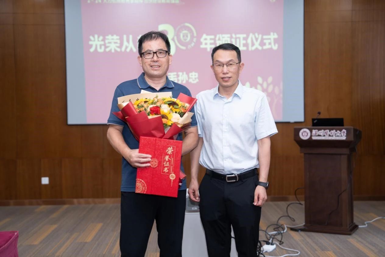 活动中,学院党委书记郑飞中为近3年荣休教职工颁发教育事业奉献奖证书并献花。荣休教职工们回忆了自己在温医的学习、工作历程,对新入职教师的到来给予热烈的欢迎和殷切的期望,对学院未来的蓬勃发展寄予真诚的祝愿。