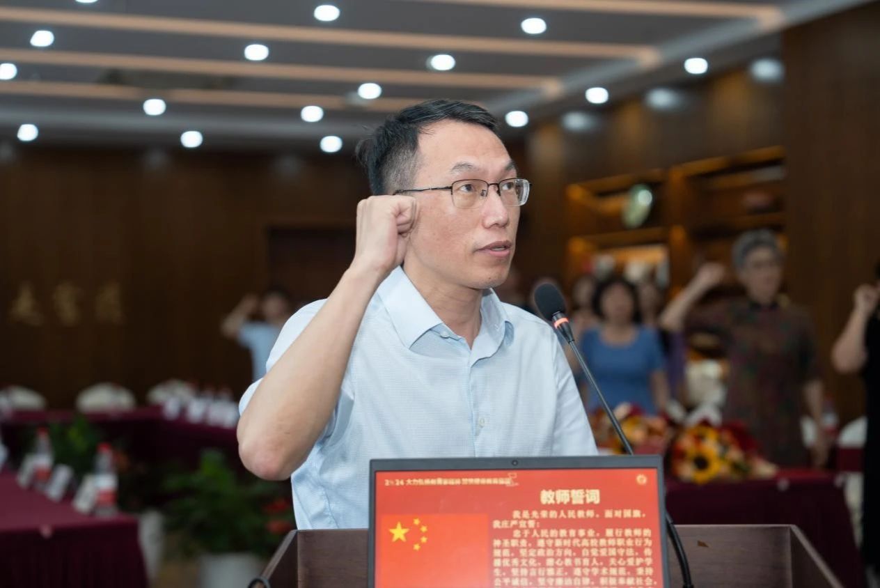 “我是光荣的人民教师。面对国旗,我庄严宣誓:忠于人民的教育事业,履行教师的神圣职责……”在薛向阳的带领下,全体与会教职工重温教师誓词。掷地有声的誓词,让大家深刻感受新时代人民教师的使命感与责任感,也是每位教职工对教育事业的庄严承诺。