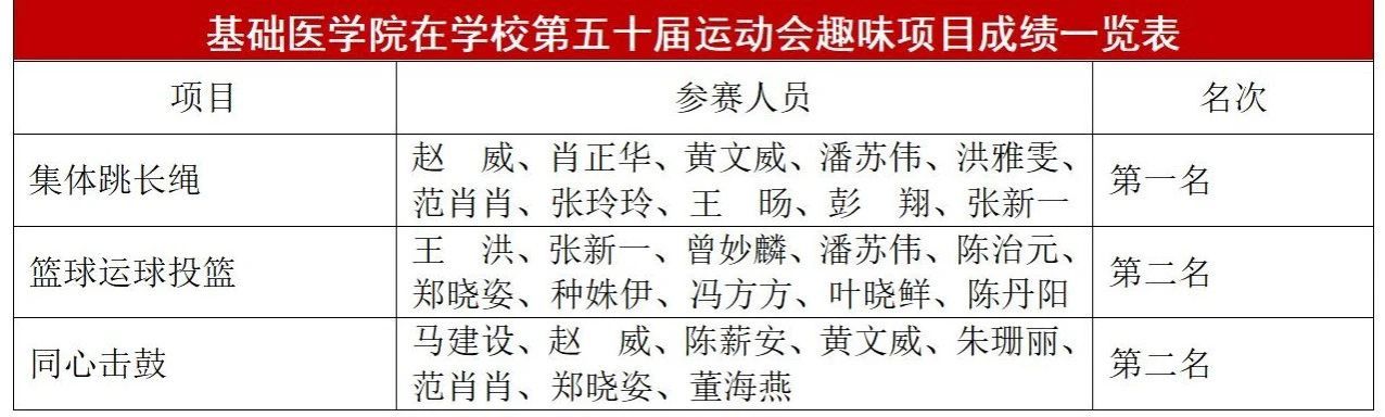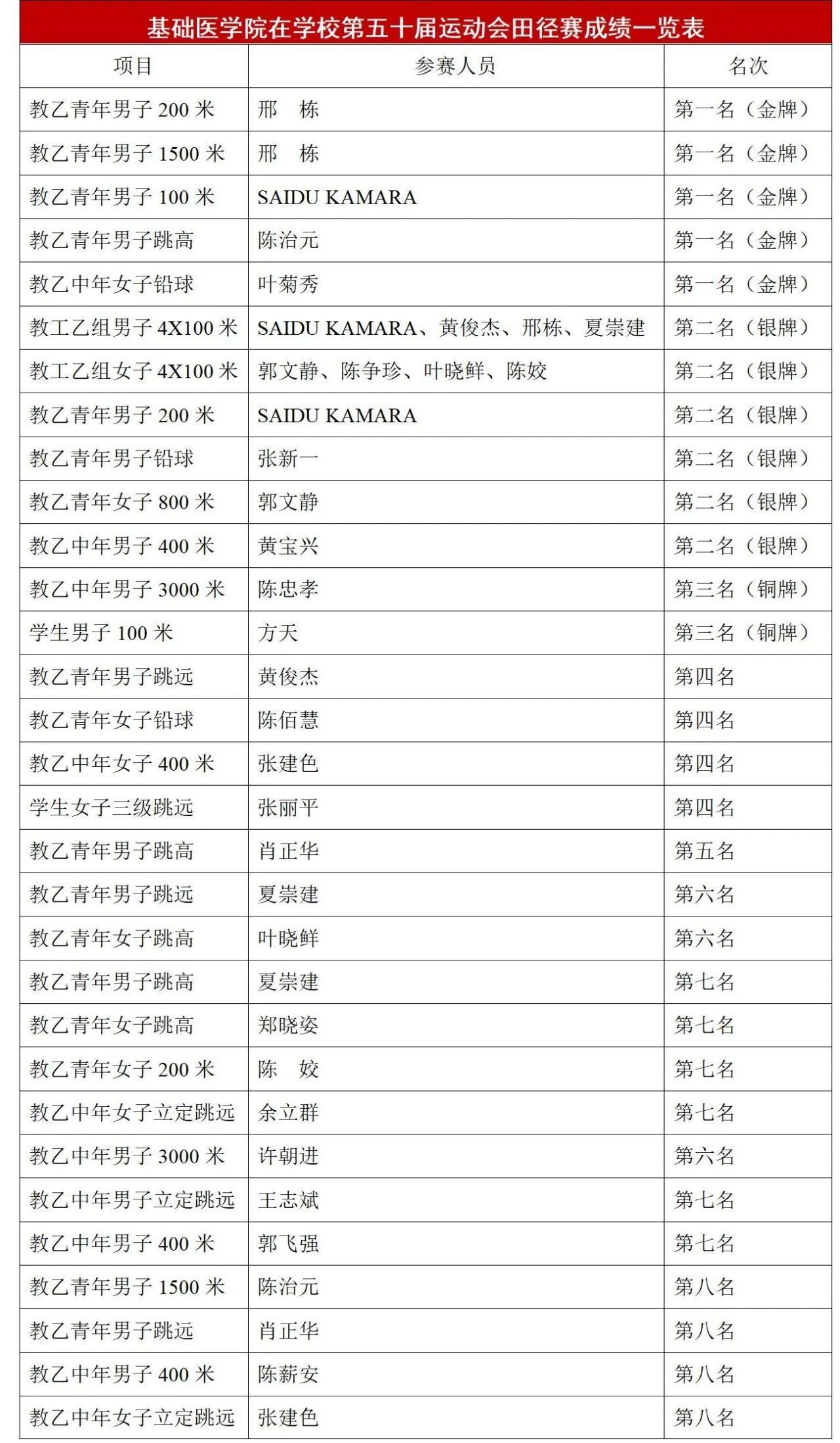 此外,在学生组田径赛中,2023级基础医学学生方天获得男子100米比赛铜牌,2024级基础医学学生张丽平获得女子三级跳远第四名的优异成绩。
