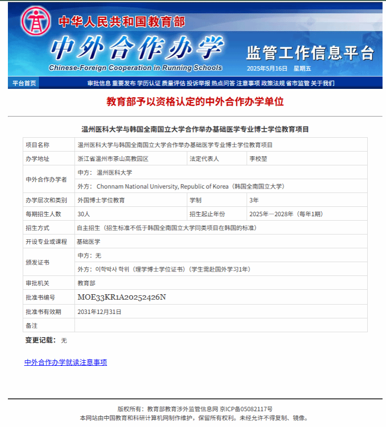 近日,教育部正式批复同意蜜桃视频 与韩国全南国立大学合作举办基础医学博士学位教育项目。该项目获批是学院深入贯彻落实教育对外开放战略的重要成果,标志着学院在推进高等教育国际化、创新高层次人才培养模式方面取得突破性进展。坚持强强联合,着力打造国际化育人新高地。项目深化融合蜜桃视频 基础医学学科优势与全南国立大学生命科学领域全球科研创新资源,创新构建“双基地+双导师”协同育人体系。采取“2+1”分段培养机制,两年依托我校夯实学科基础,...